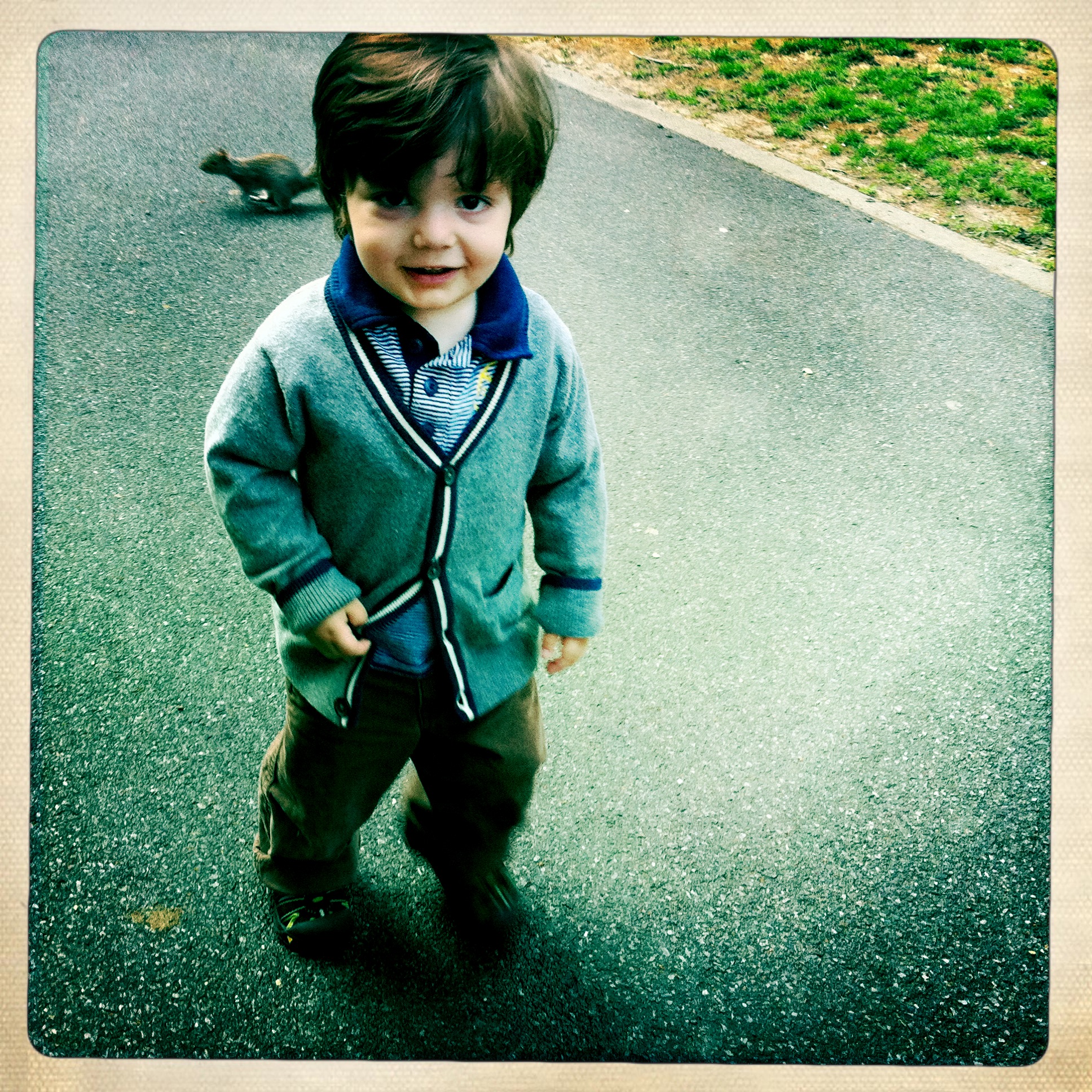 It became clear to me that I do not indeed wish for my son to grow up one minute faster than necessary.  This was an uncomfortable scene for me.  Where were the adults chanting “Good job, good job!” to their sons as they do on the playground?  How could these boys be here all alone?  I pictured their mothers at home adjusted to not controlling where their sons are every moment.  Could this be H one day trying to impress other preteen boys with curse words?  No, dear universe, please, as long as is possible (and developmentally normal), let H be a clingy little boy who screams “MOMMY!” as I try to sneak out of the apartment on occasion or into the bathroom.  I was panicked–then suddenly comforted as my son slid off the bench to chase a squirrel; I had a feeling that we were ok for the moment.  H had some water, laughed at the squirrels and pointed out an airplane above us.  Then I carried him the rest of the way to the park.