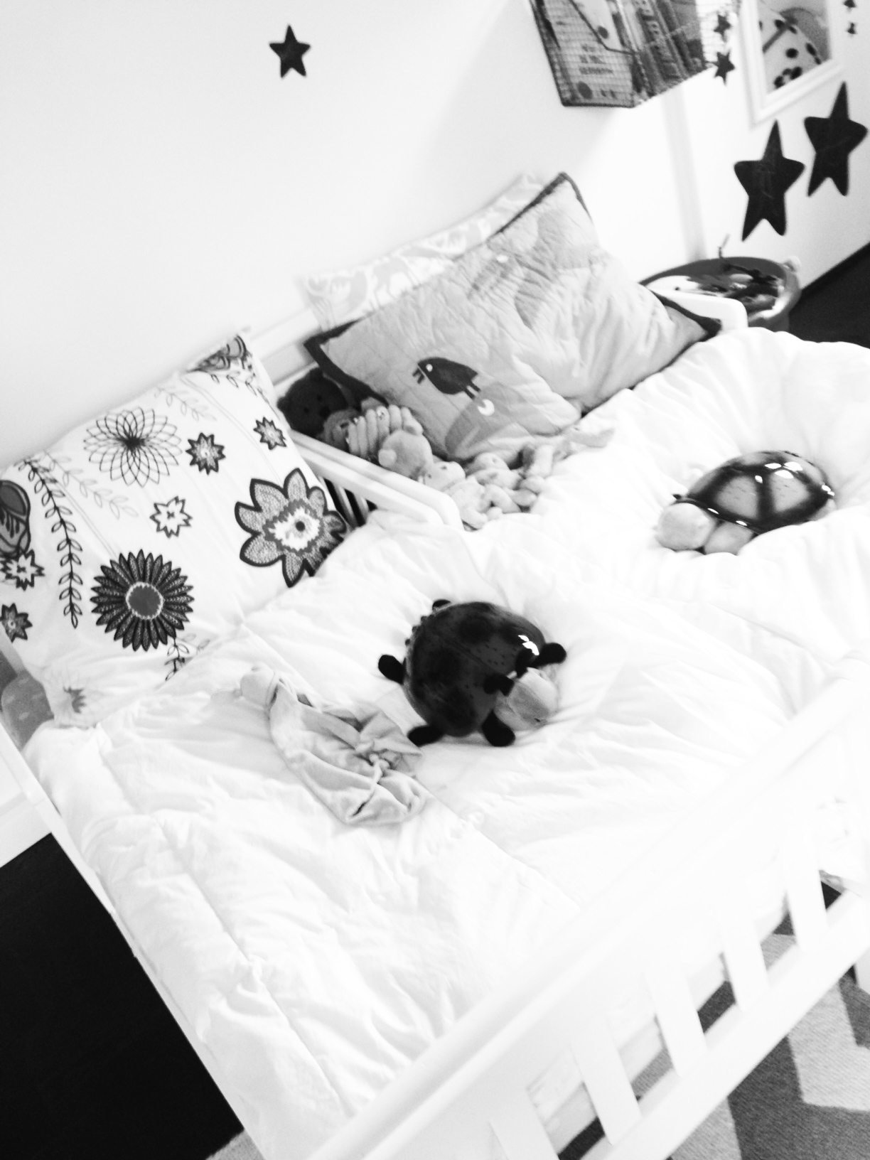 Most nights they are lit up the moment each child is in his or her bed. Three sky-fulls of stars fill their bedroom walls and ceiling. They change colors, and back again. The room glows orange or blue or red, or orange and blue, orange and red. Henry likes to coordinate the color of his turtle with the girls’. A crescent moon appears, then another, and another. Three moons among the sea of glowing stars. They they fall asleep under the night sky of another universe.