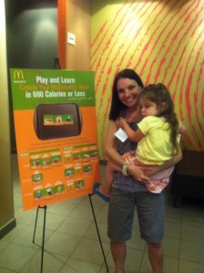 My four-year-old daughter, Molly and I went first to McDonald’s in the Chelsea section of Manhattan for the launch of the new Happy Meal, an event hosted with Moms and the City. I remember Happy Meals from my childhood. Oh, do I remember them well. Growing up in the suburbs lent itself to drive-thru cuisine. It is less that case in the city. I don’t think my three children have been to a McDonald’s other than during a road trip the Cape Cod. While my husband is a life-long McDonald’s fan, I gave up fast food (except when I’m pregnant), and I would rather my kids not develop a taste for it–historically, the fried, the fatty, the super sized. Still, I went to the event open minded because as parents, we really have to be aware of available choices. And hungry. I went there very hungry.