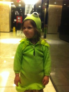 This is E trying on the Kermit suit when we arrived home. You may guess that no one fought over that costume, no one cried, there were absolutely no bulging frog eyes being thrown around my living room.