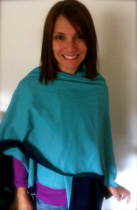 Mine is navy and–my new favorite color–turquoise, and can we worn on either side. It is made of waterproof material, is soft and comfortable and folds up small enough to fit in a normal-sized bag (not that I own a normal-sized bag; mine are all enormous). I haven’t noticed any issues with wrinkling, even at the bottom of my monster purses under sippy cups, sticker books, catalogs and cheddar bunnies. They are priced similarly to a nice scarf or wrap at $48.00. Choose from four very hot color combinations–just don’t buy the turquoise, okay? I still want to be the only one wearing this.